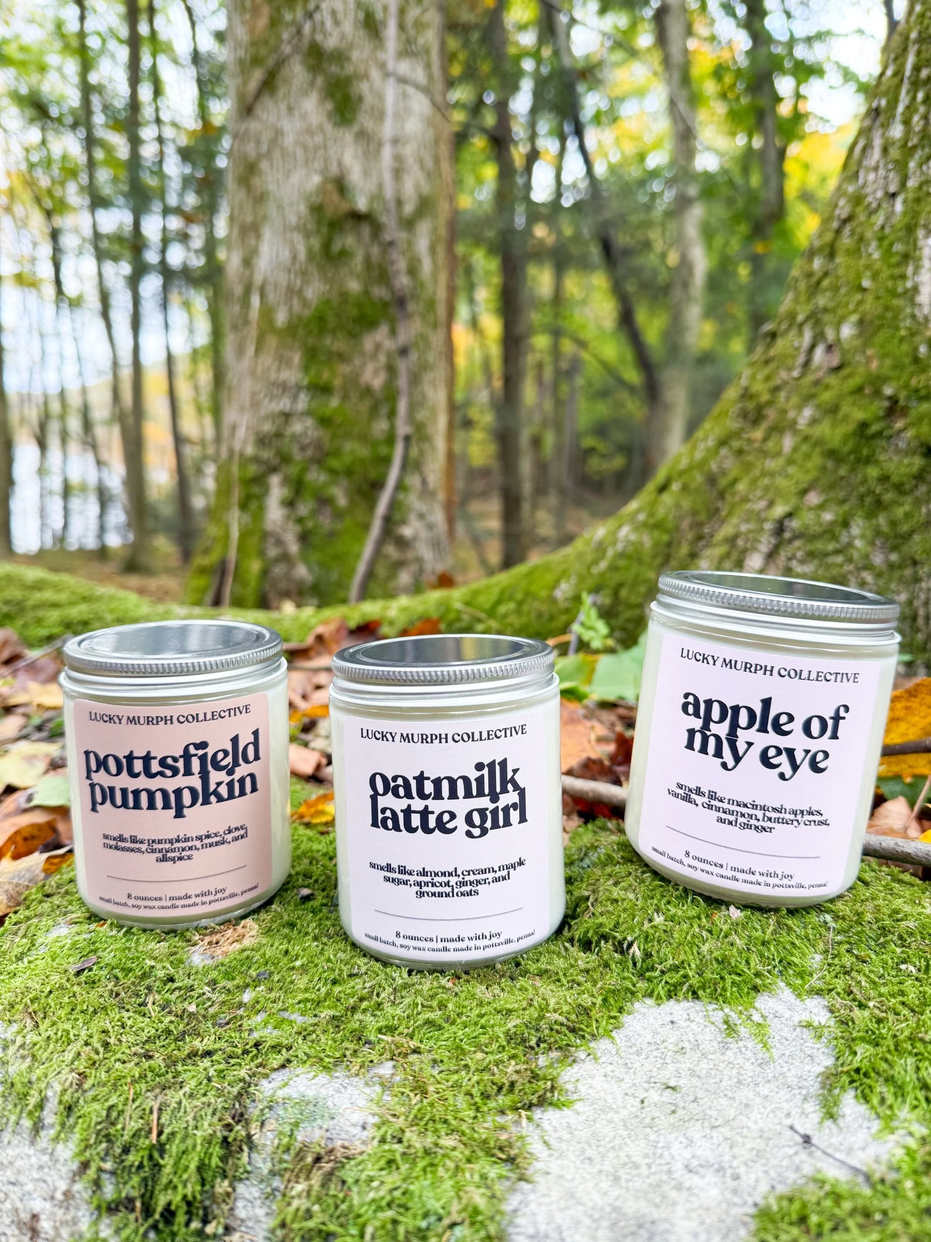 Shop › FALL GIRL BUNDLE Image 1 of 3 Image 2 of 3 Image 3 of 3 FALL GIRL BUNDLE $45.00 All three fall drops, Pottsfield Pumpkin, Apple of my Eye, and Oatmilk Latte Girl!8oz / Soy Wax Quantity: Add To Cart Added! All three fall drops, Pottsfield Pumpkin, Apple of my Eye, and Oatmilk Latte Girl!8oz / Soy Wax