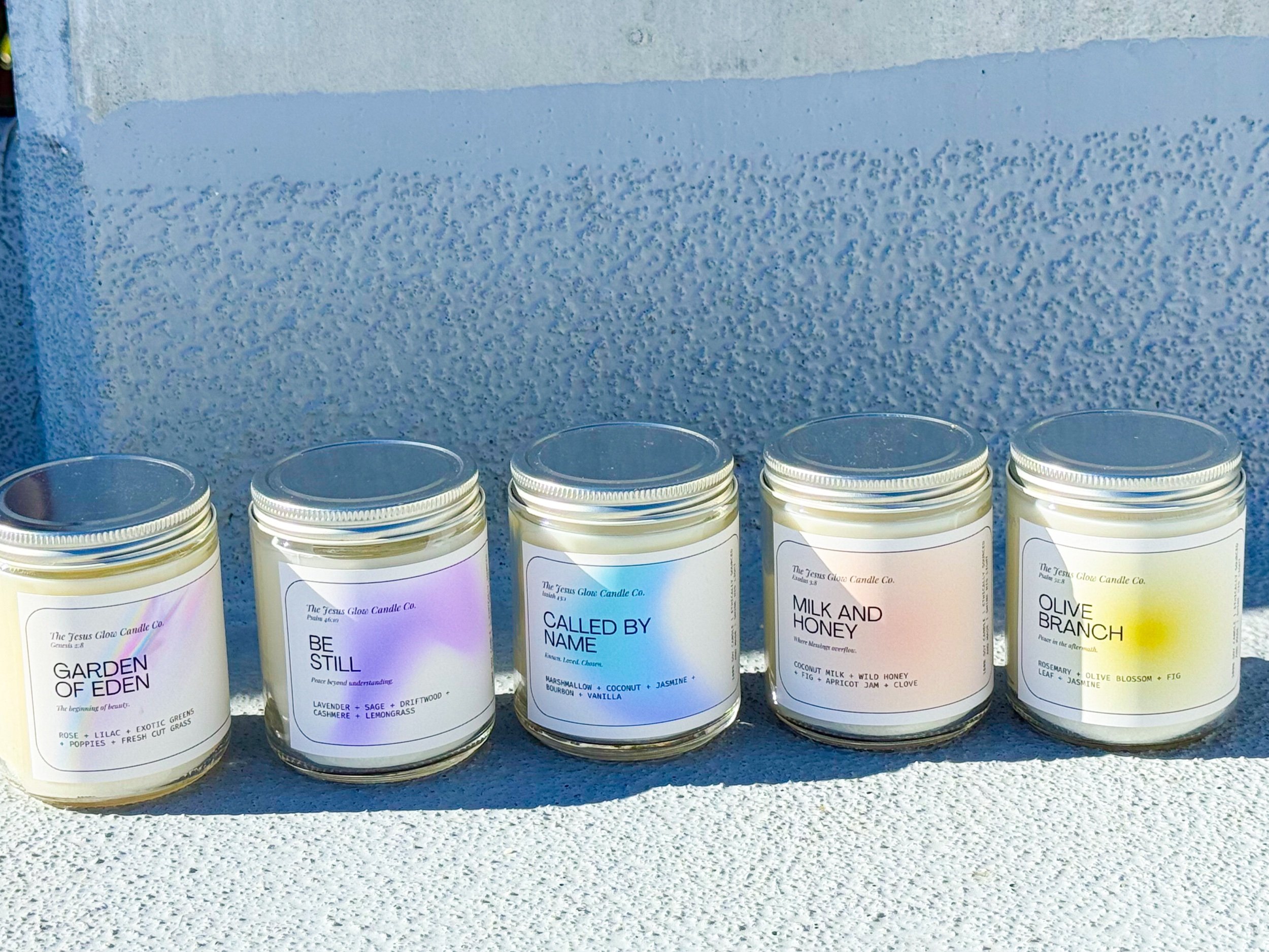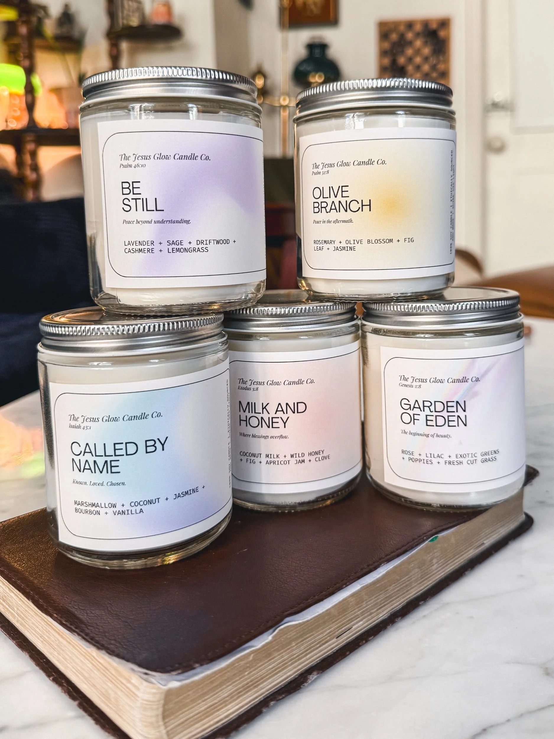 Shop › The Jesus Bundle Image 1 of 4 Image 2 of 4 Image 3 of 4 Image 4 of 4 The Jesus Bundle $60.00 Includes all 5 core candles: Olive Branch, Garden Of Eden, Called By Name, Milk and Honey, and Be Still.8oz / Soy Wax Quantity: Add To Cart Added! Includes all 5 core candles: Olive Branch, Garden Of Eden, Called By Name, Milk and Honey, and Be Still.8oz / Soy Wax